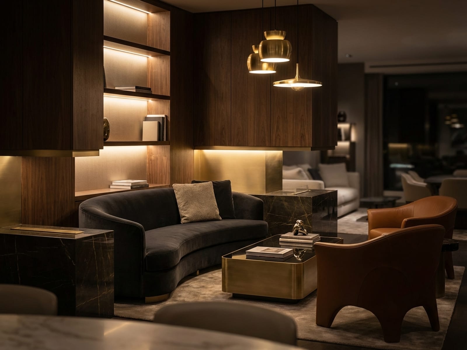 A sophisticated urban retreat featuring Italian furniture and Scandinavian lighting. The design balances warmth with metropolitan edge.